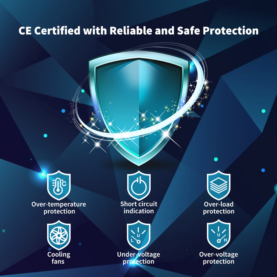 | High Voltage Shutdown: 16.3Vdc | Battery supply & AC main transfer time within 50mS |
